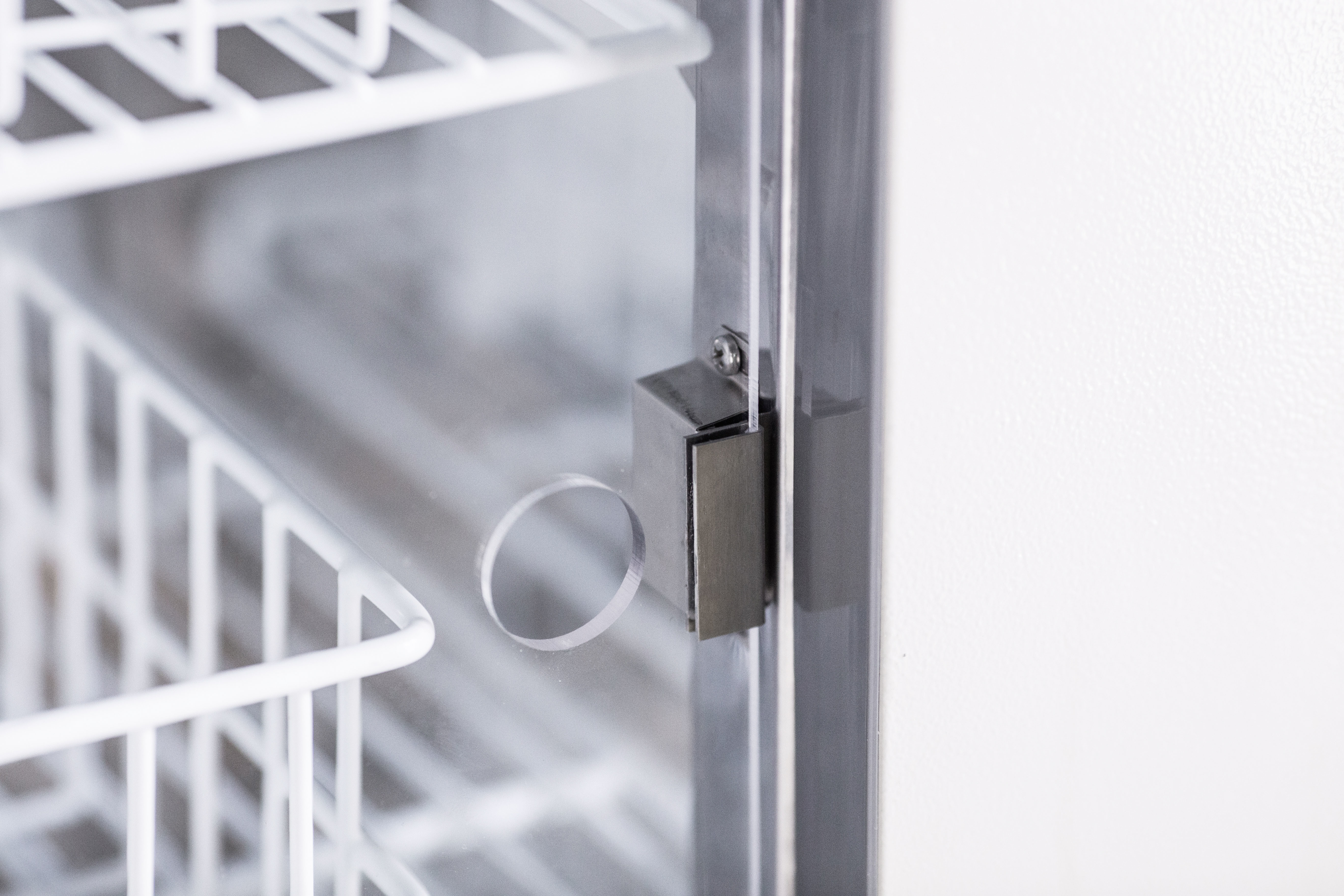 Inner doors and auto on/off cooling fan to prevent cold air from leaking out when the door is opening.